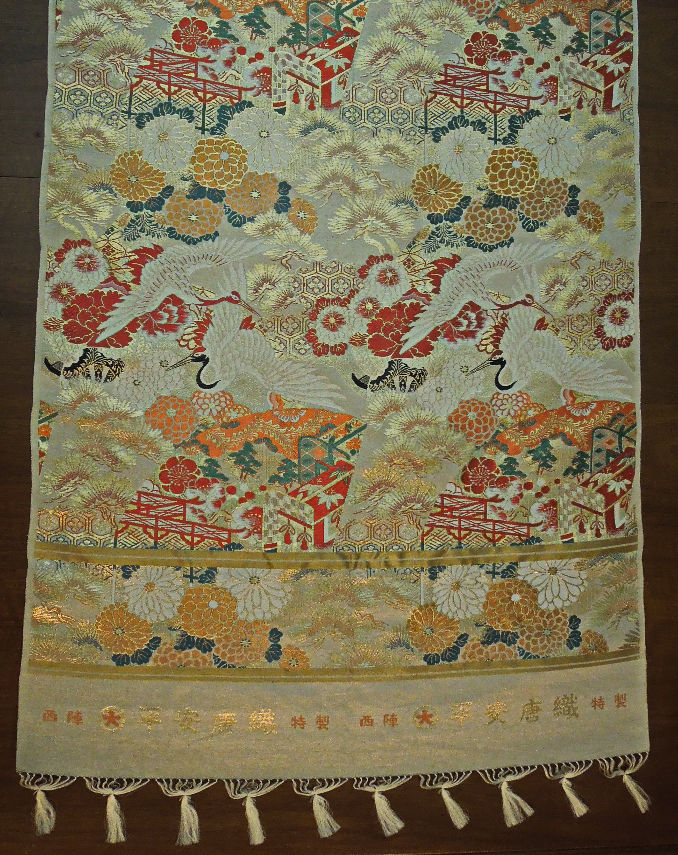 Japanese brocade fabric, from Nishijin district, Kyoto. RBT received this as a gift from a Japanese businessman. The bottom reads (left to right - repeated twice):