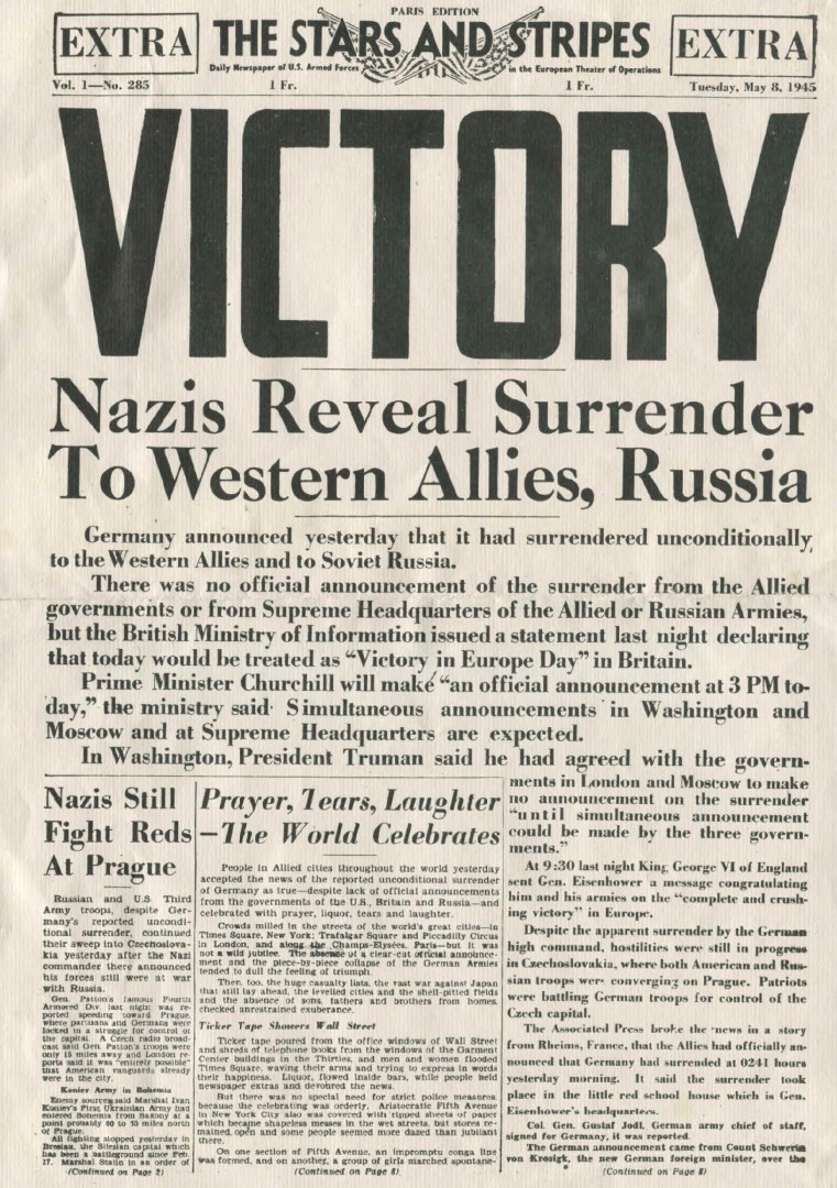 Dad is holding the Stars and Stripes, May 8, 1945 Paris Edition. Access the front page here.