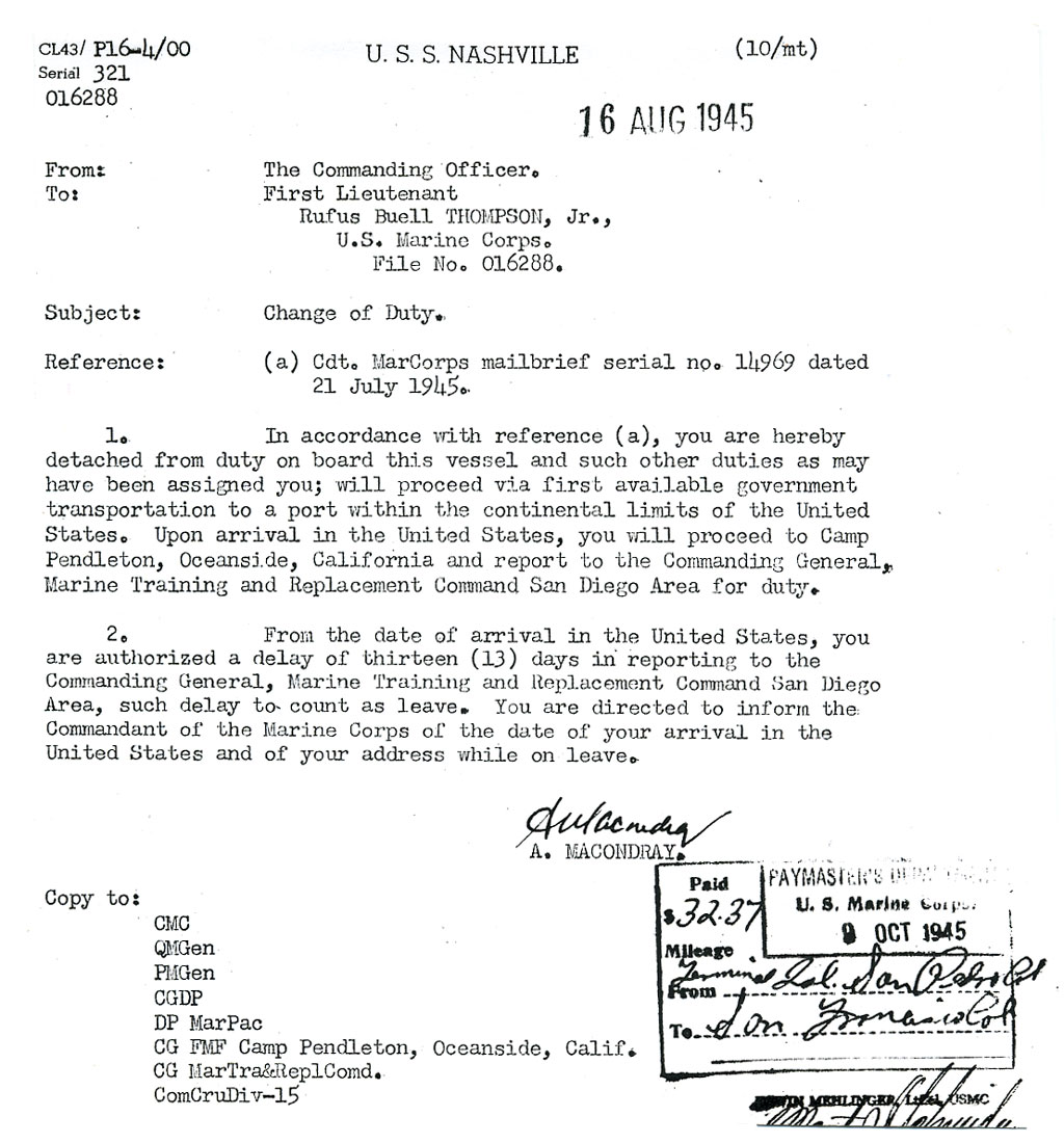 orders, releasing him from the Nashville on 16 August, 1945, the day after VJ Day