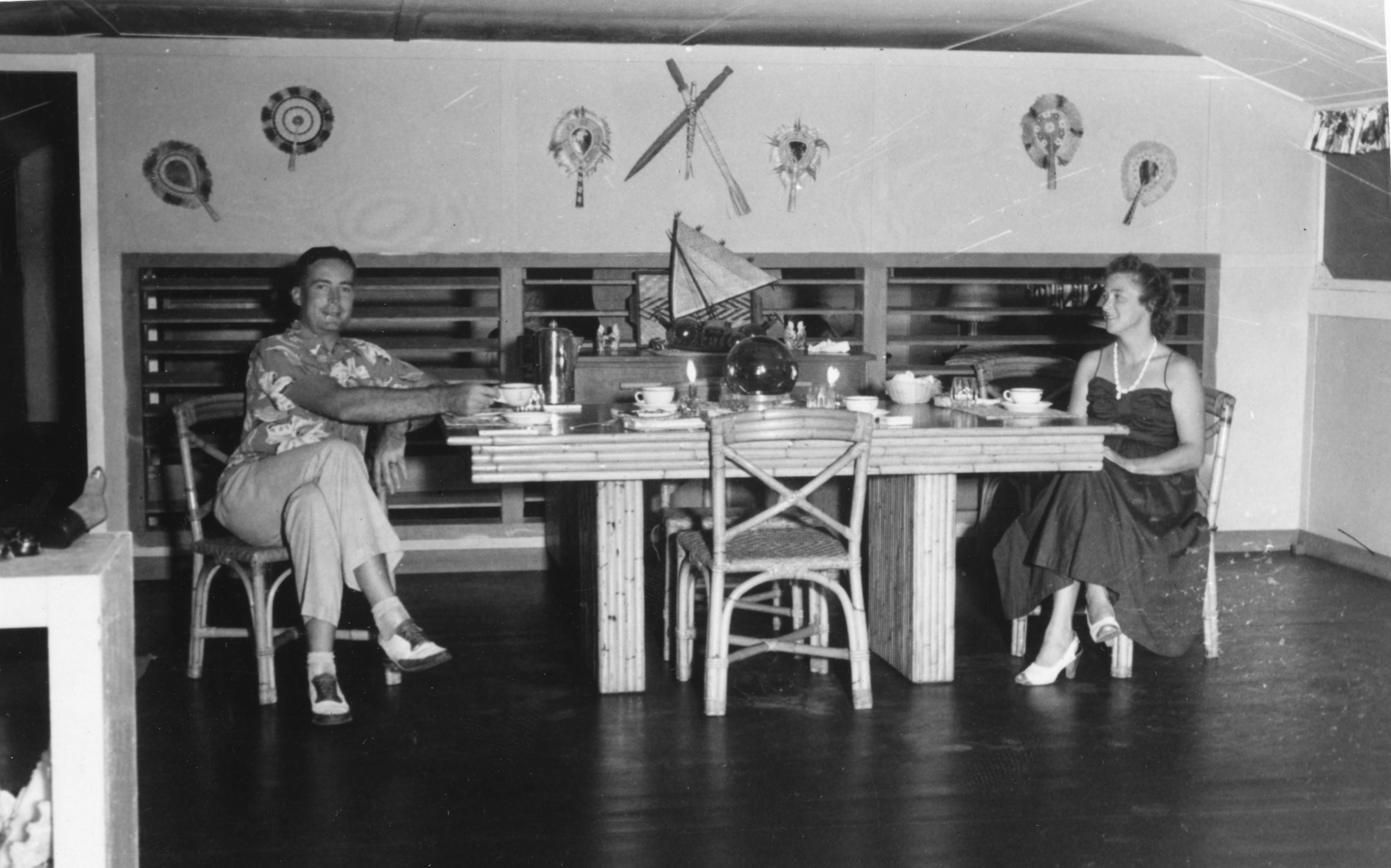 In this photo, some of the Marshallese handicrafts from our photo album, collected between 1950 and 1952, can be seen in use as household decorations in the family dining room on Kwajalein in 1952.
