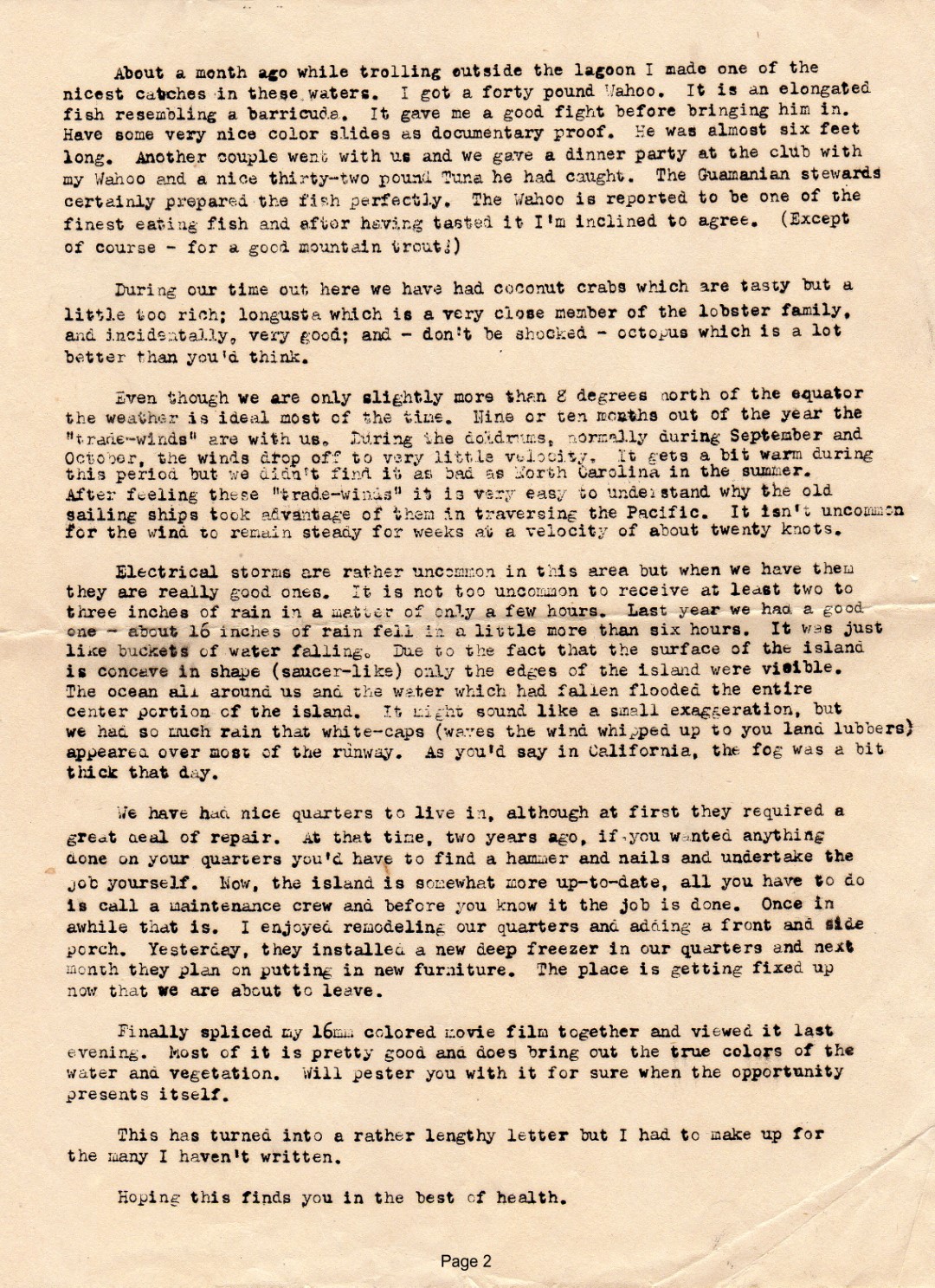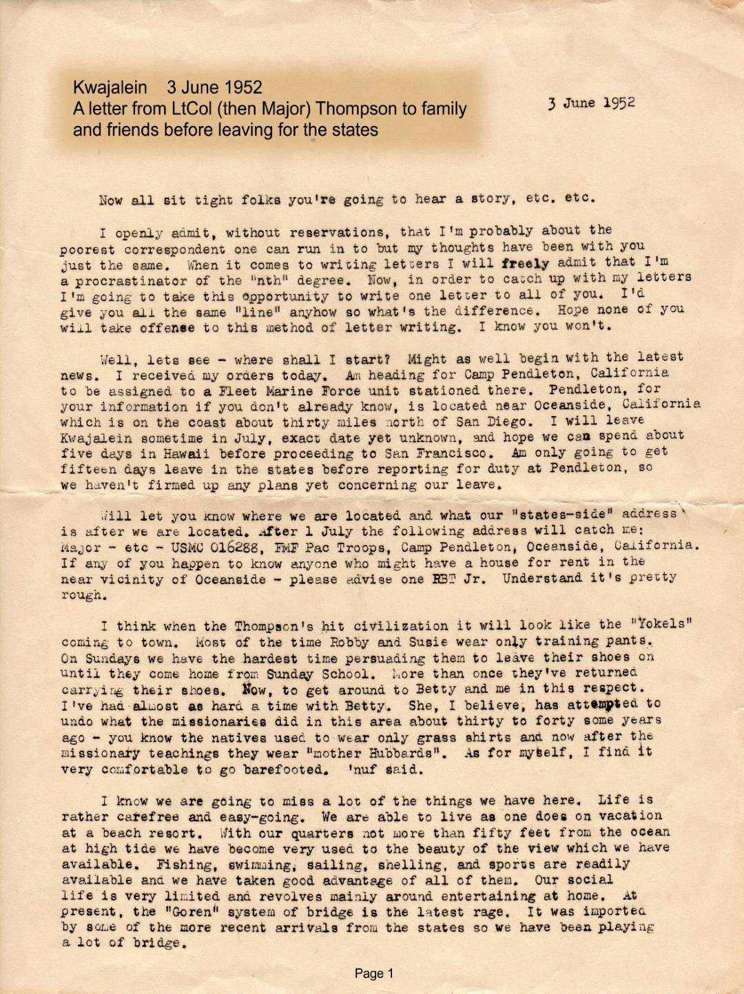 In February 2020 we found a letter from Major Thompson written just before the family left Kwajalein.